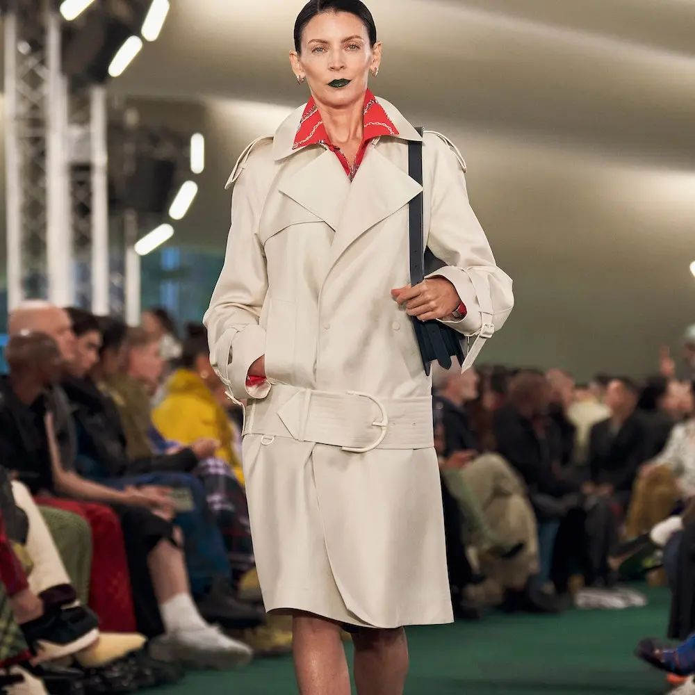 ロエベやリック・オウエンスのボトムスはハイウエスト。 バーバリーは、ブランドのクラシックなトレンチコートをローライズのシルエットに仕上げました。 コム デ ギャルソンのピーターパンの首輪やヴィヴィアン ウエストウッドのボタンなど、特大のアクセサリーもたくさん見られました。