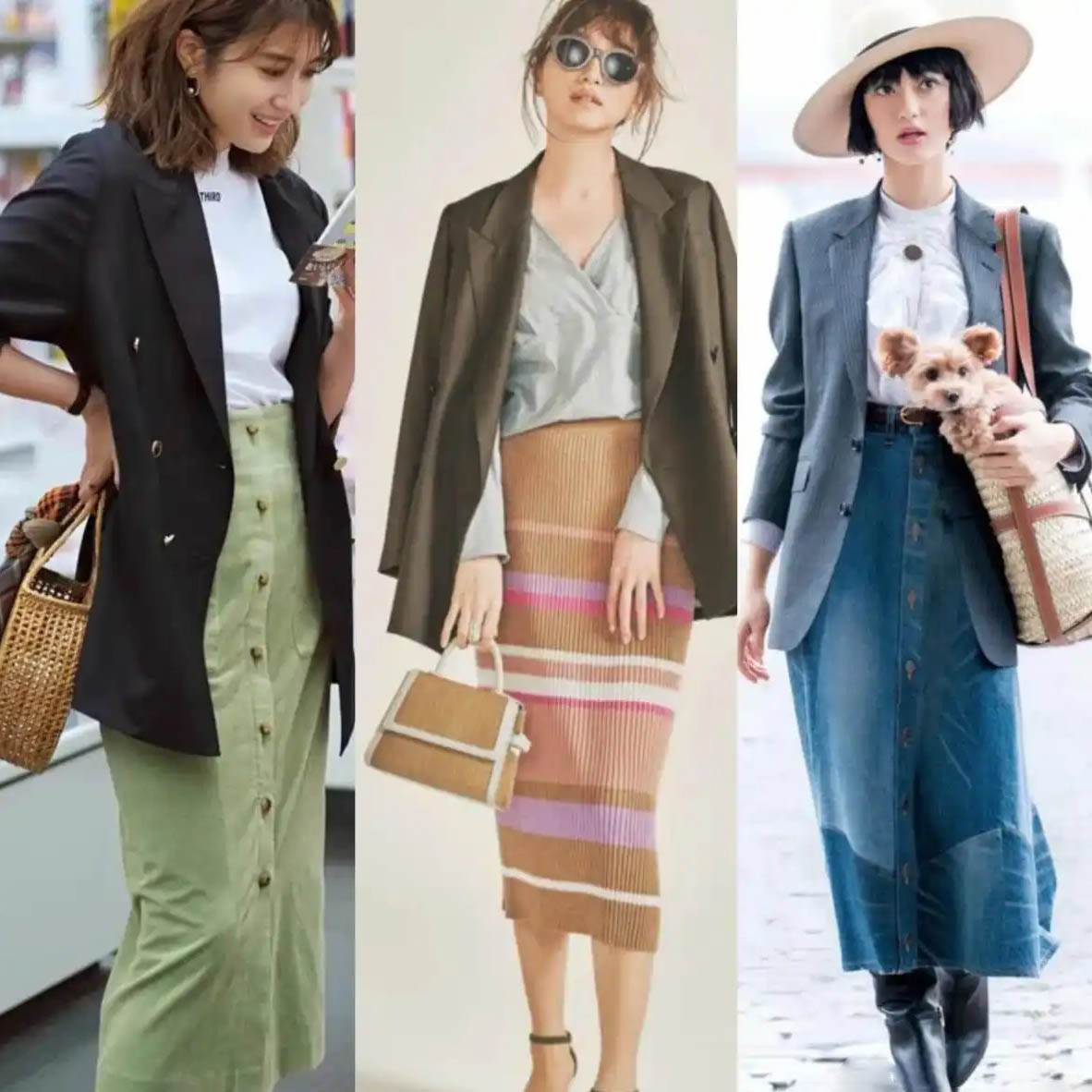 フェアリースカートと比べると、タイトスカートとスーツの組み合わせはスタイルアップ効果がより優れています。ニットスカートやデニムスカートは、ウエストとヒップのラインを美しく引き立て、女性らしいエレガントな魅力を演出してくれます。