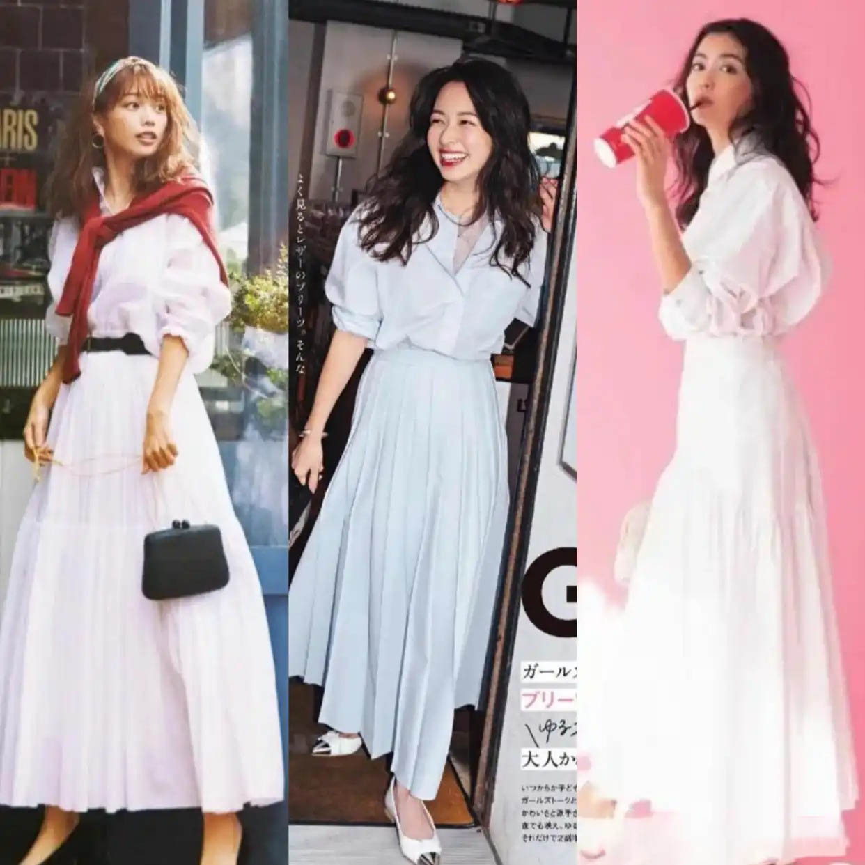 プリーツスカートを合わせれば、大人の女性にとってエレガントながらも堅苦しくなく、自然に馴染むスタイルに。特に白シャツ×白プリーツスカートの組み合わせは、初恋のような甘くピュアな雰囲気を演出してくれます!