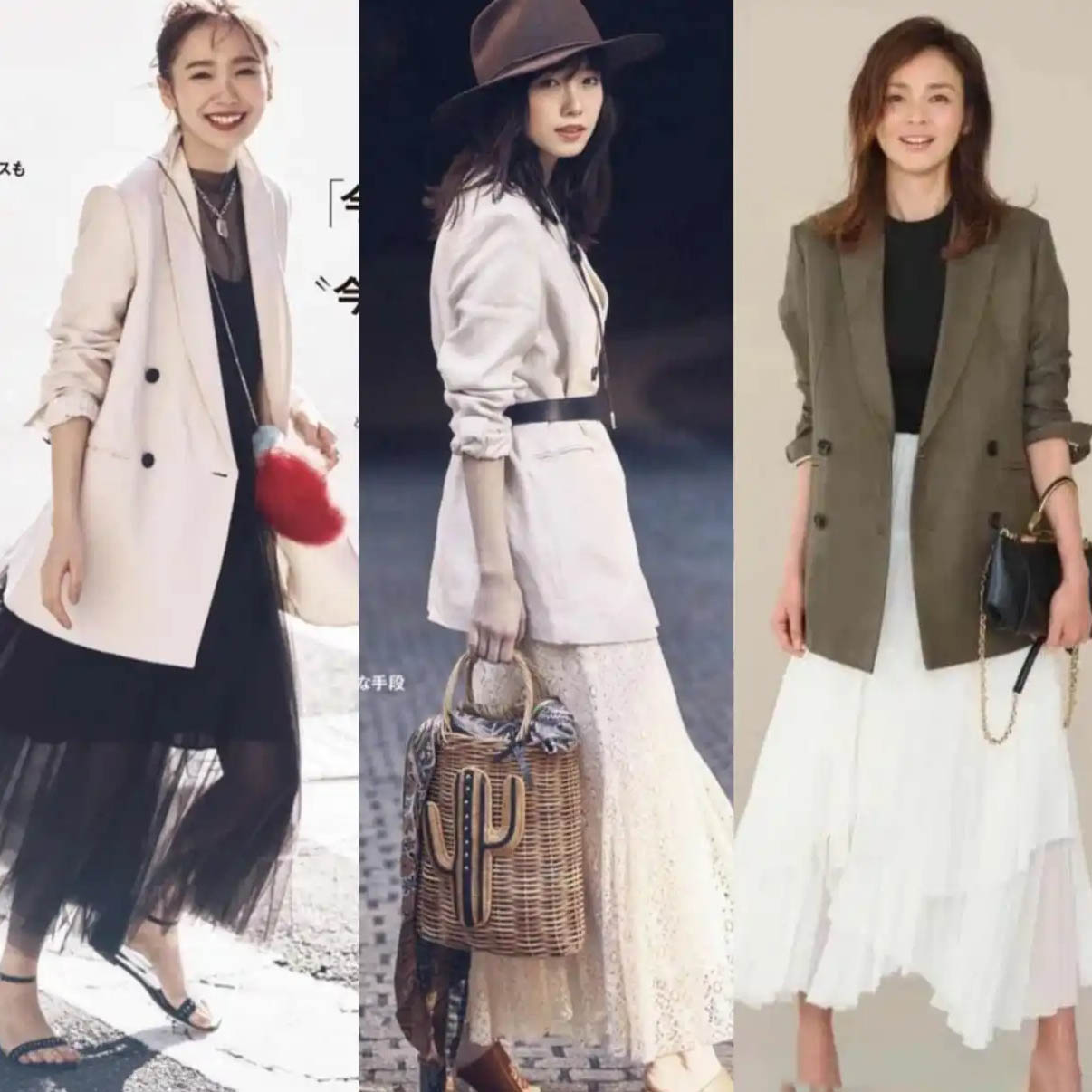 黒い紗のスカートは軽やかでゆったりとしていて、白いレースのスカートや白いプリーツスカートは柔らかくて甘く、スーツの堅苦しさを中和しています。 2つの要素を組み合わせることで、気質がよりエレガントになります。