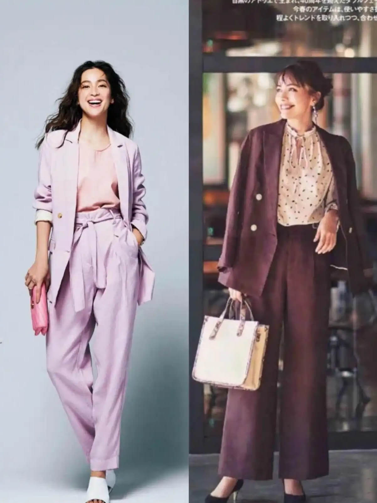 タロイモ色の紫のスーツに同じ色のインナー、足元は白いオープントゥのハイヒールサンダルを合わせれば、新社会人にぴったり!アンゴラレッドのスーツに黒のポインテッドハイヒールを合わせたスタイルは、職場の成熟したエリートにぴったりです。