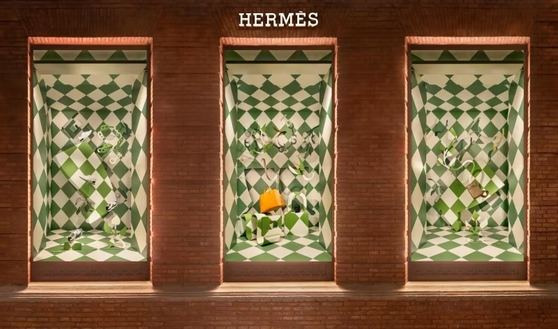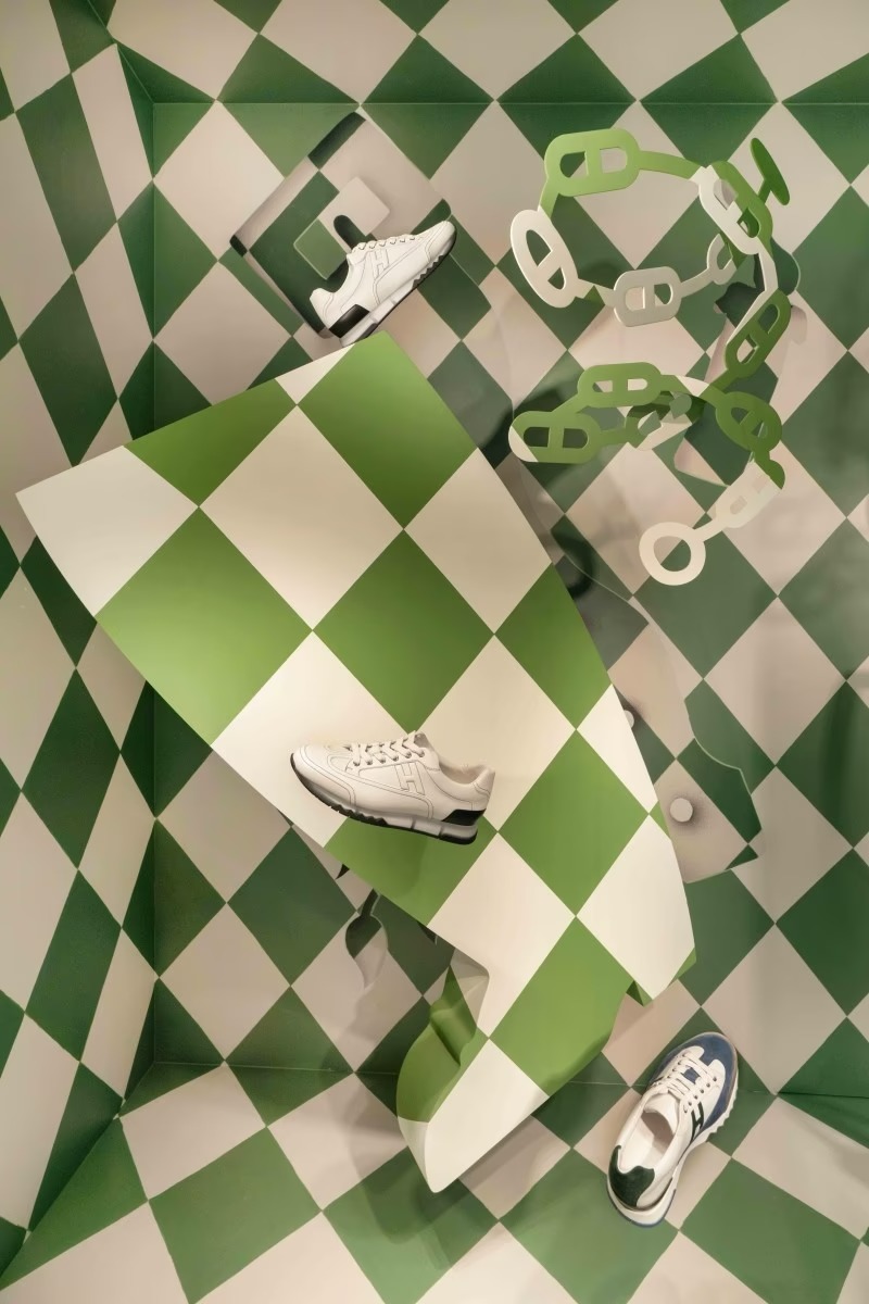 今回のウィンドウディスプレイでも、象徴的なモチーフがふんだんに散りばめられています。メンズコレクションのディスプレイでは、《Trail》スニーカーが緑豊かな背景の中で軽やかに描かれ、まるで錯視のように実像と影が交錯します。また、蛇のようにしなやかなベルトが春の目覚めを象徴し、背景にはエルメスの馬術の伝統を彷彿とさせるグリーンの菱形パターンが施されています。