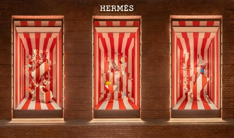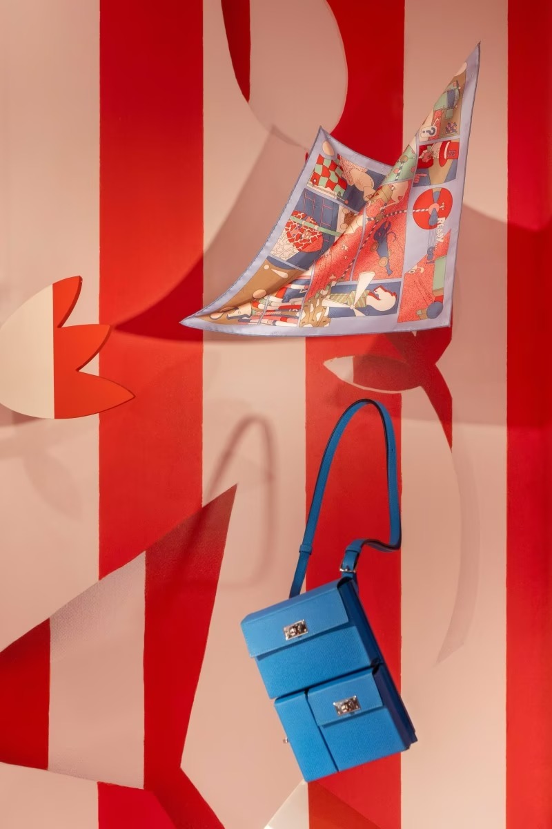 レディースコレクションのウィンドウでは、《Kelly Multipocket To Go》バッグが春風に舞い、背景には赤と白のストライプが大胆に描かれています。これは馬術競技の障害バーから着想を得たもので、躍動感に満ちています。さらに、カクテルグラスが静かに佇み、春のピクニックやアウトドアのひとときを連想させます。