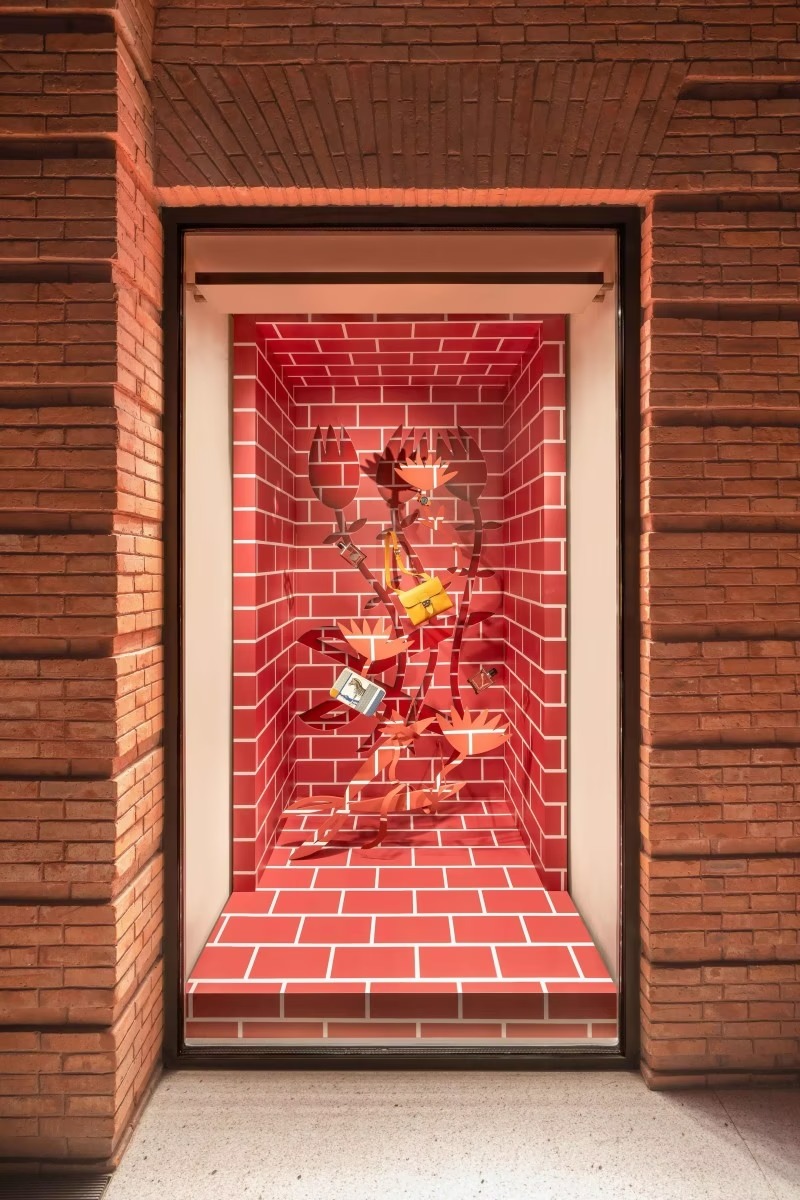 アクセサリーコーナーには、バーニー香水が花々に囲まれ、シプレー調の香りを漂わせます。ミニ・メドールバッグは、柔らかい花びらの中から顔を覗かせ、まるで春風に誘われるように軽やかです。背景には、上海エルメスメゾンの外壁からインスピレーションを得たレンガ模様が施され、建築とアートの対話が生まれています。
