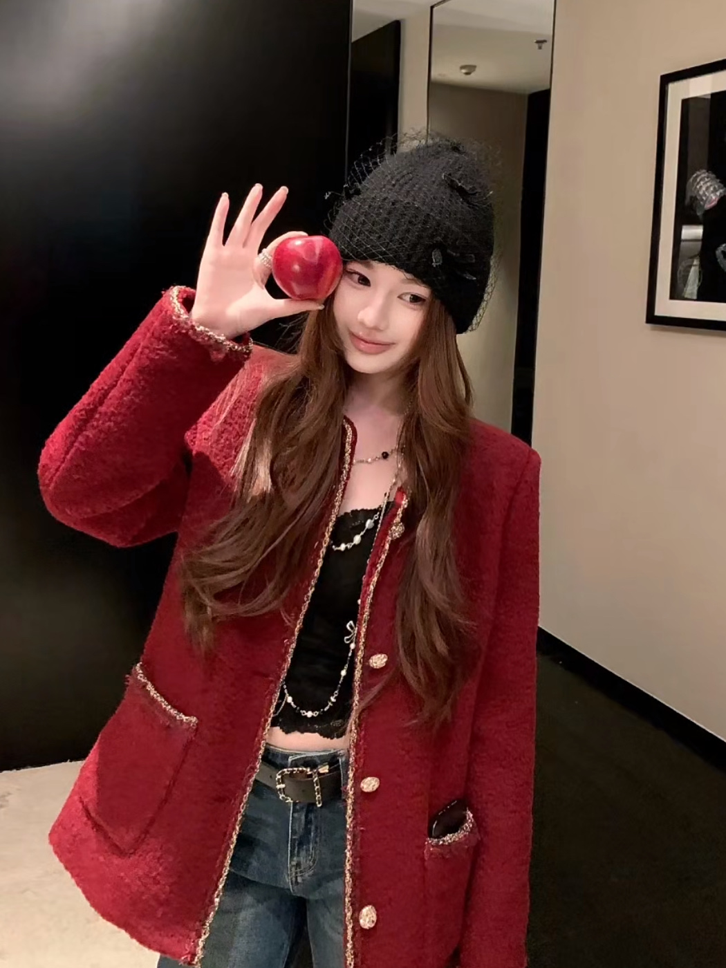 襟元・前立て・ポケット・袖口には、レッド×ゴールドの織テープを配し、配色のコントラストで一気に奥行きと華やかさをプラス。高級感があり、どこかフェスティブなムードも感じさせます。