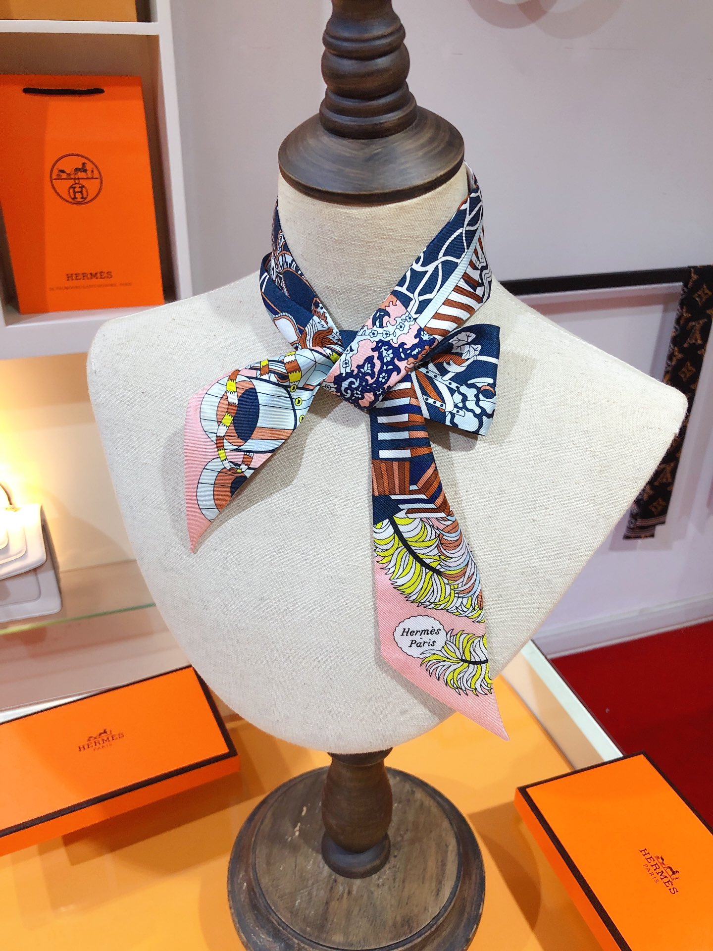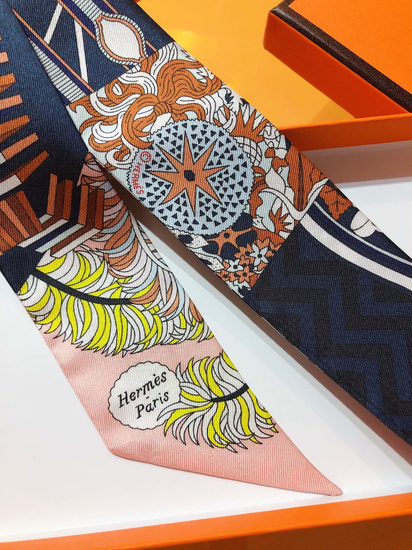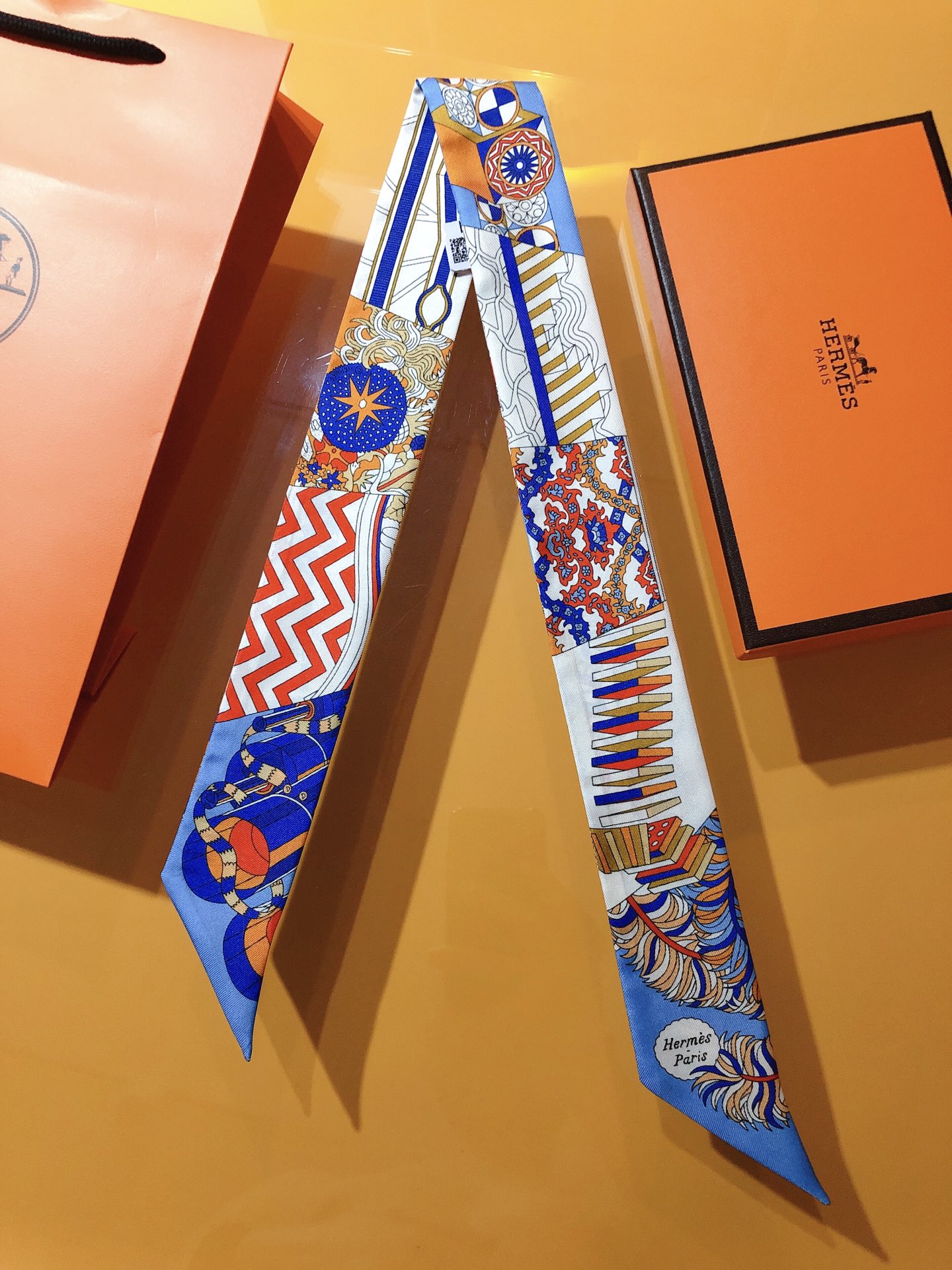 エルメス(HERMES)のツイリースカーフです。青・赤・白を基調とした幾何学と伝統文様の組み合わせが魅力的。シルク 100% の上質素材で、バッグや髪飾りとしても活躍。専用箱付きで、プレゼントにも最適な一品です。