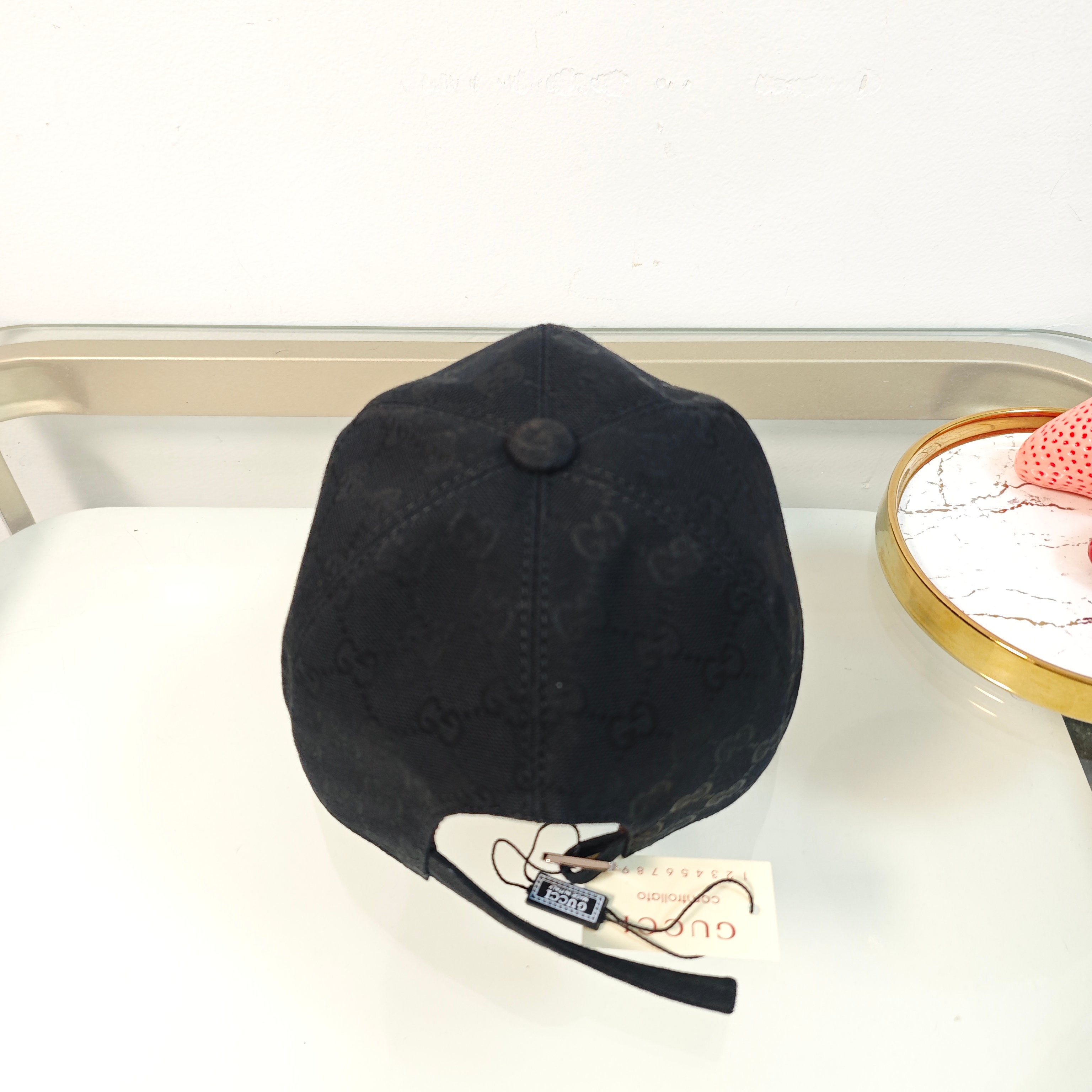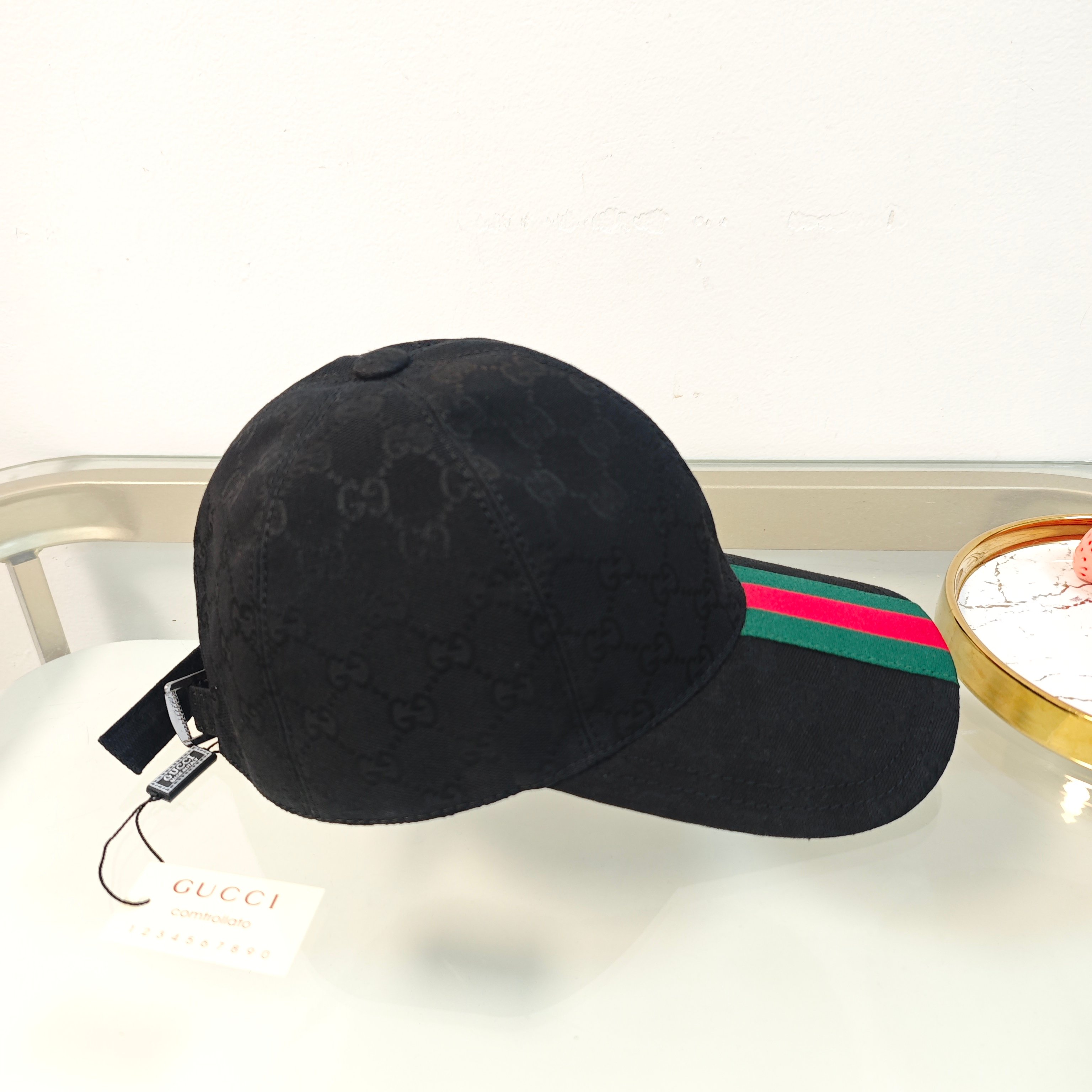 オールブラックを基調としたこのベースボールキャップには、GGキャンバスが採用されており、フロントにはアーカイブの「ウェブ」ストライプがアクセントとしてあしらわれています。