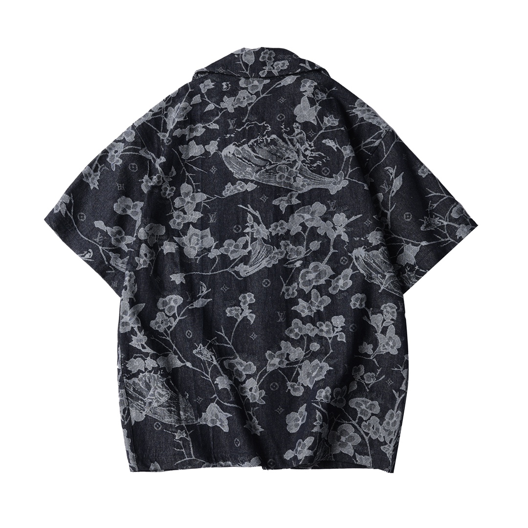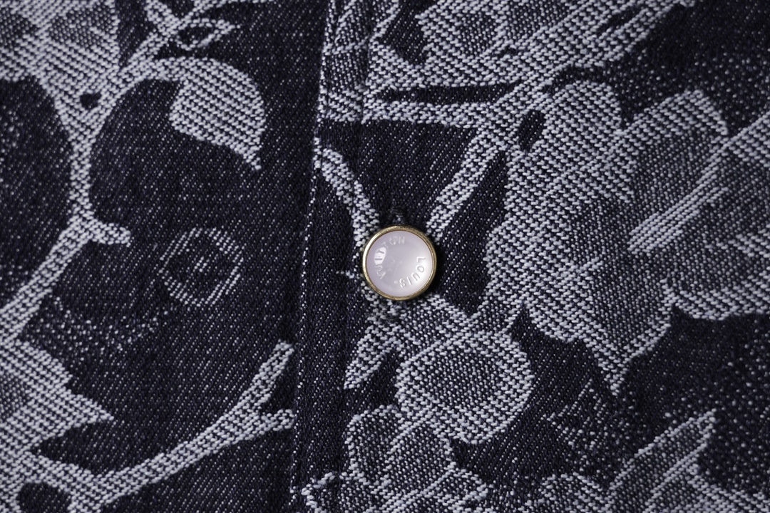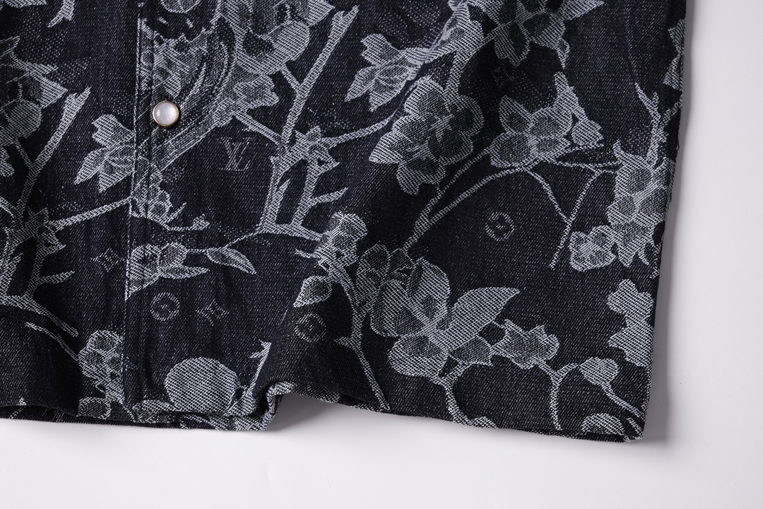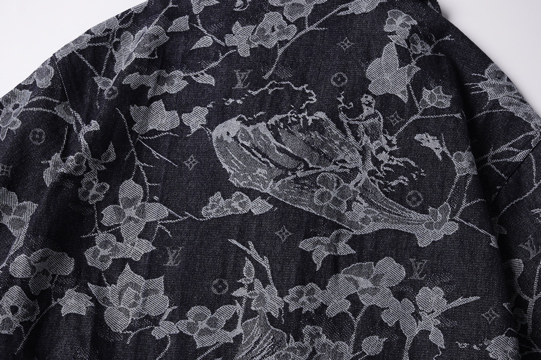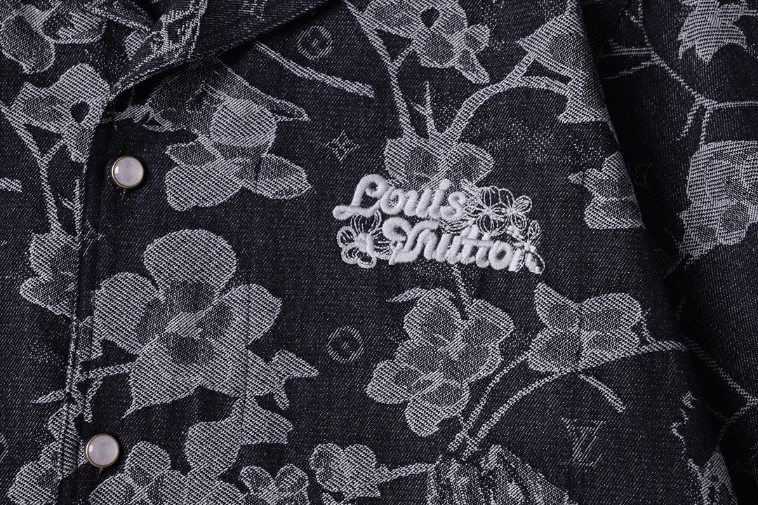 ルイ・ヴィトンのアイコニックなモノグラムとエキゾチックなフラワーモチーフを融合させたジャカード半袖シャツ。デニム調の生地に立体的な柄が映え、オープンカラーデザインがストリートスタイルに最適。上質な素材感と洗練されたデザインで、デイリーから特別なシーンまで活躍します。