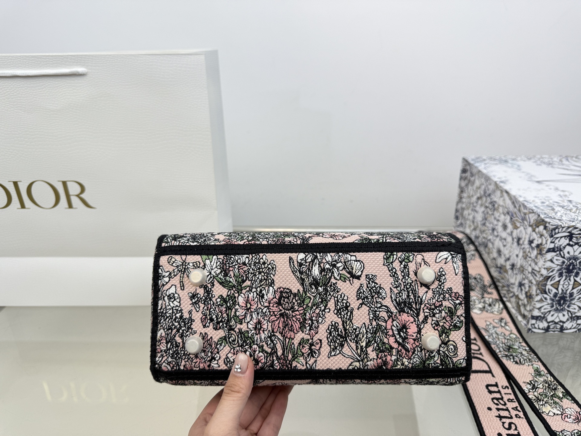 ピンクの「Dior Flowers Calendar Allover (ディオール フラワー カレンダー オールオーバー)」モチーフを刺繍しています。