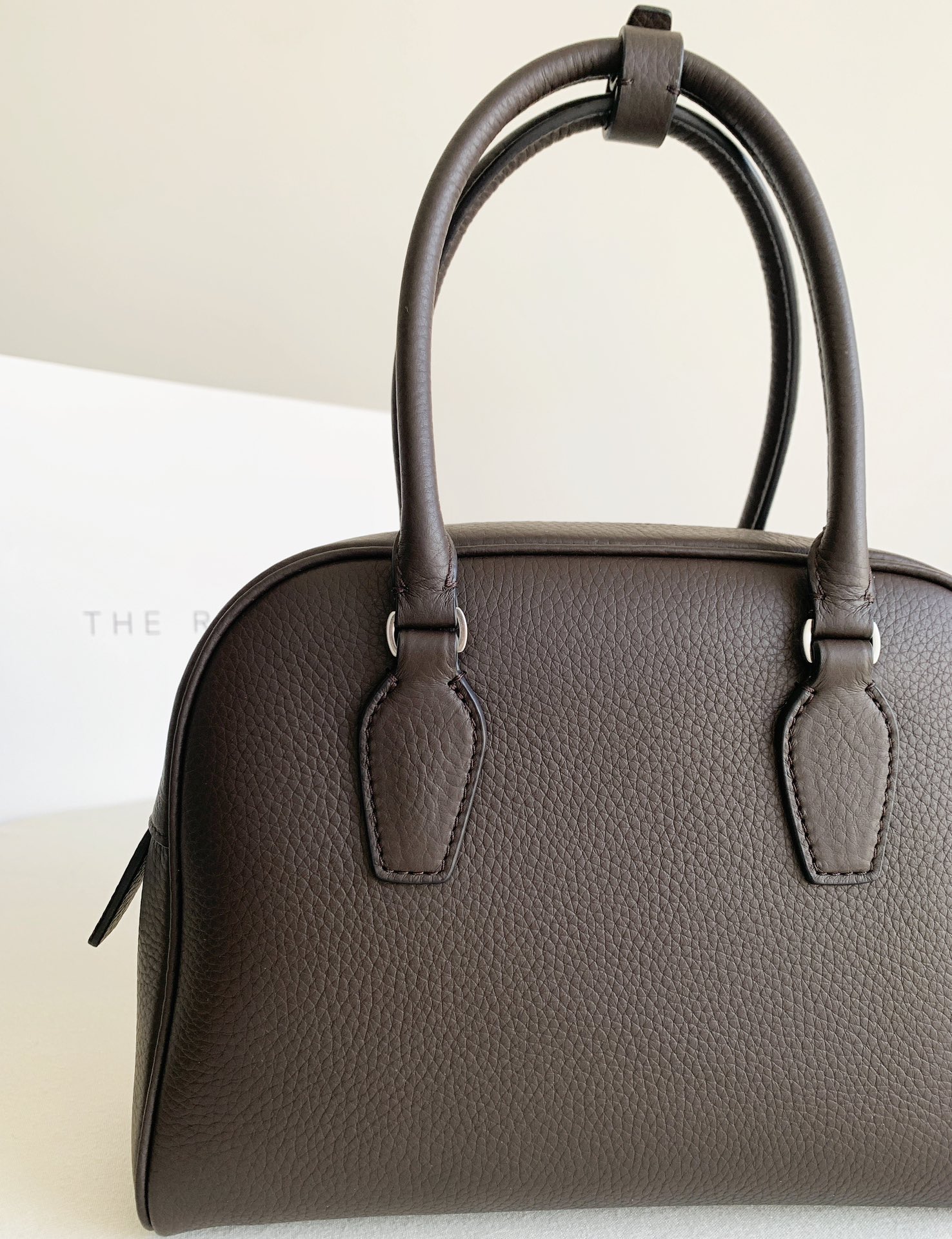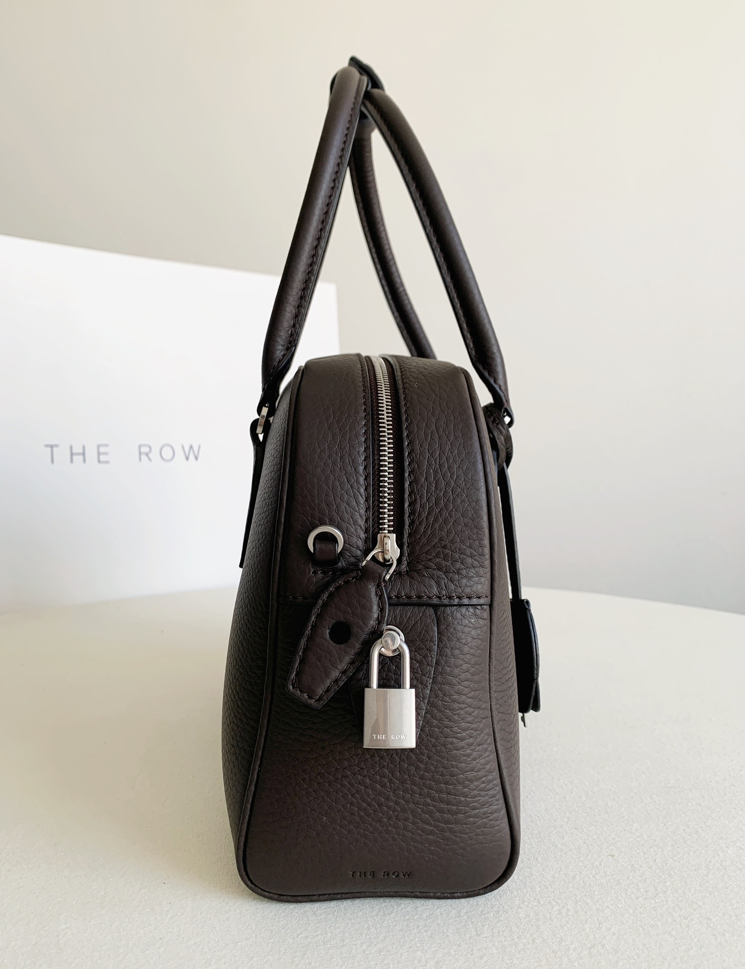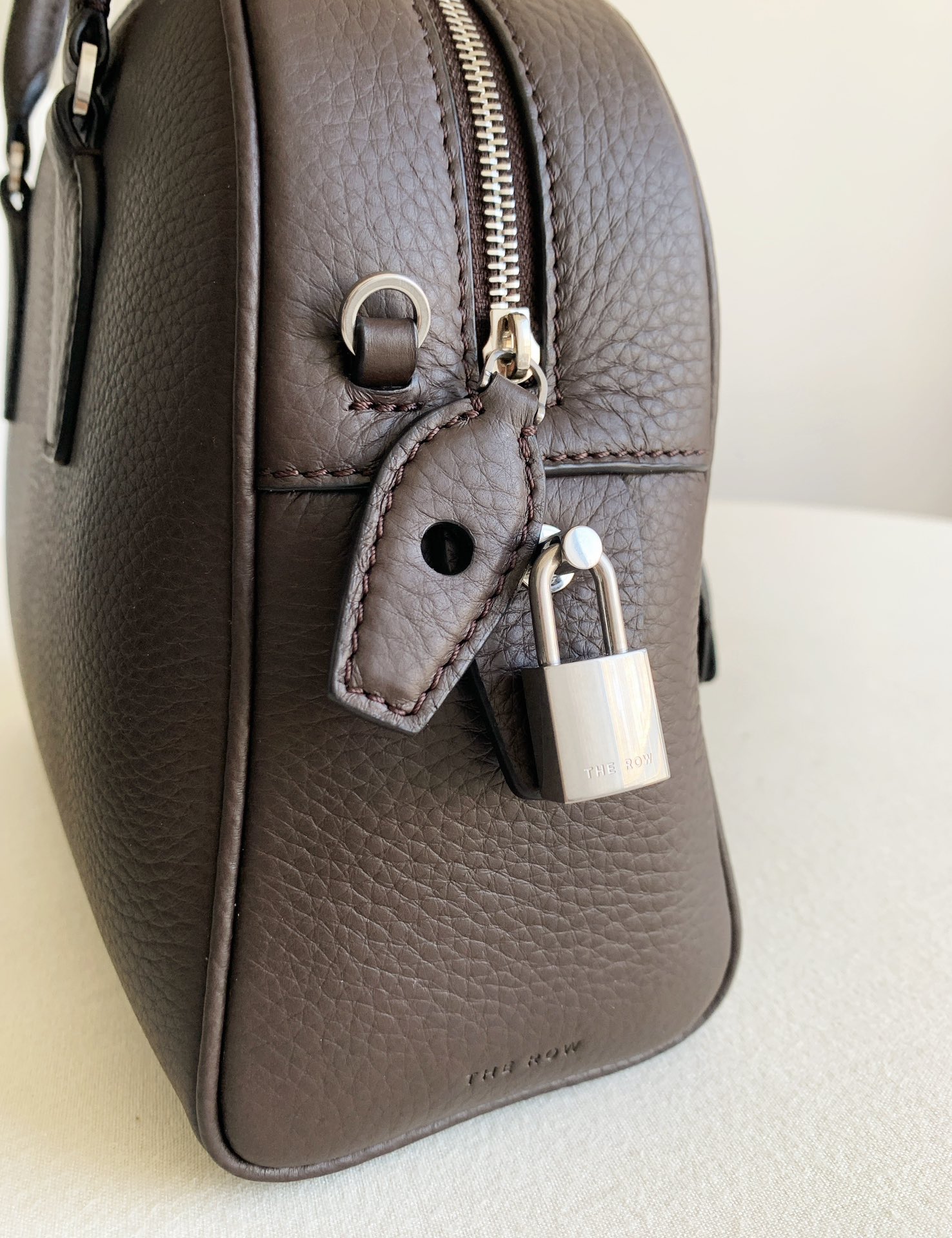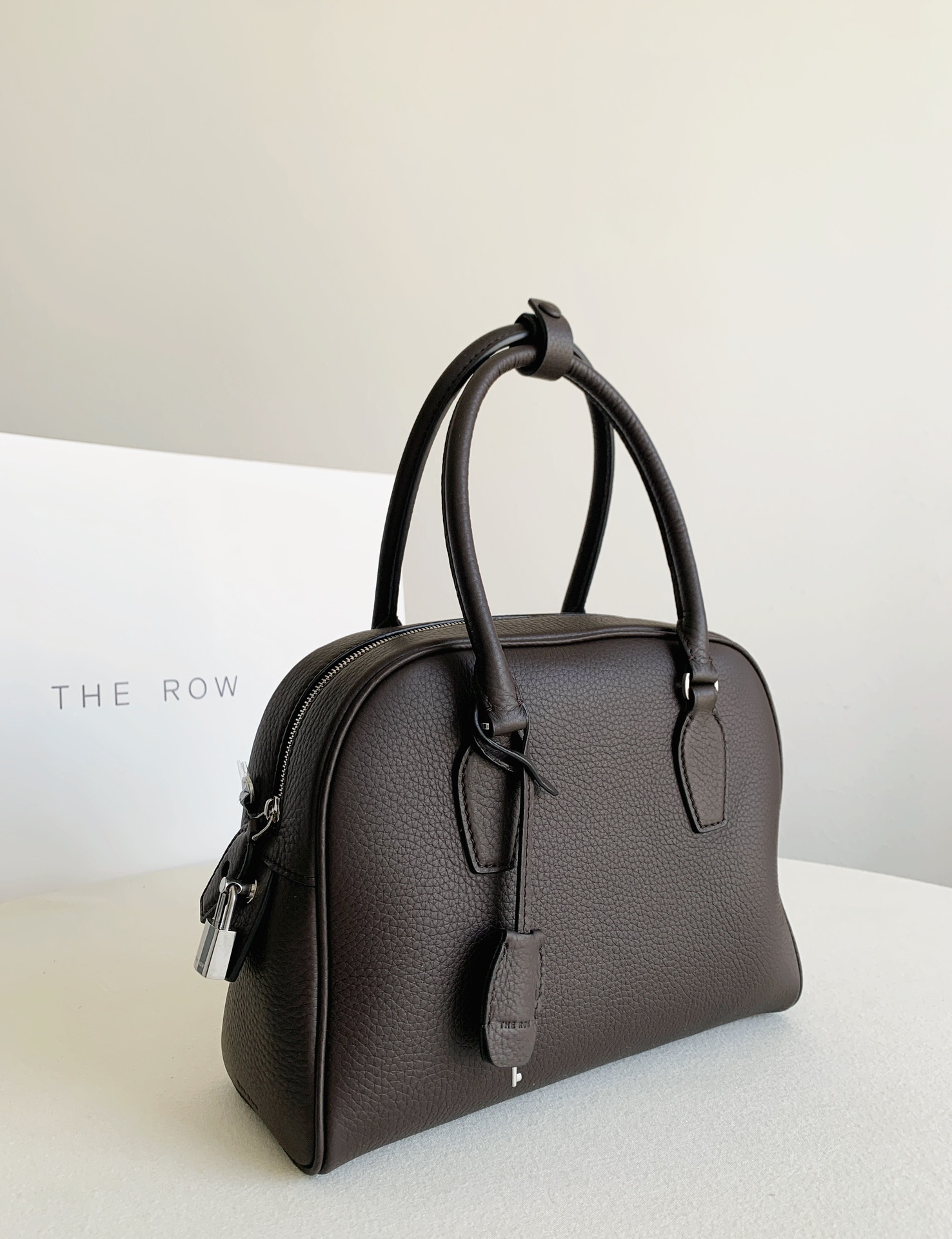 THE ROWの「India 10.0」トップハンドルバッグは、自然な風合いのカーフスキンレザーを使用したボウリングシルエットで、しなやかな手触りが特徴です。ブランドロゴ入りのメタルパドロックと鍵で、ジッパーをしっかりと閉じることができます。
