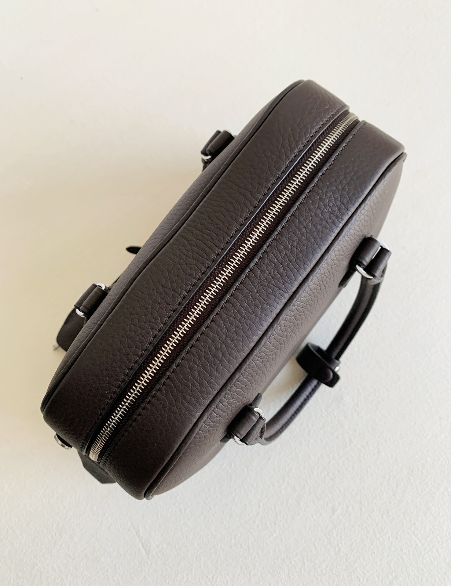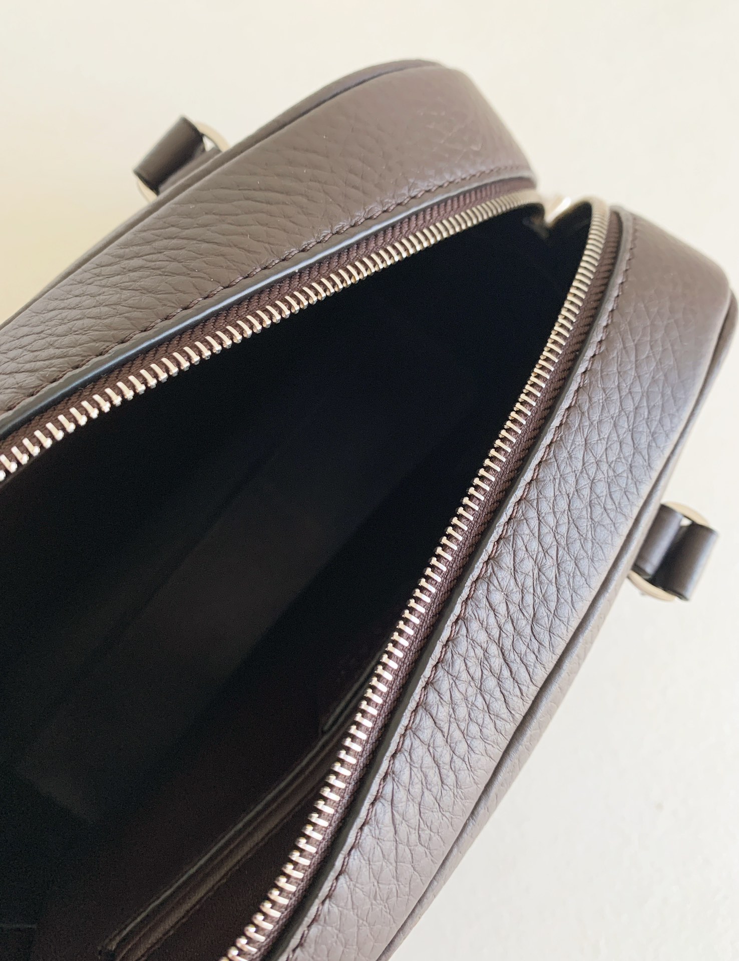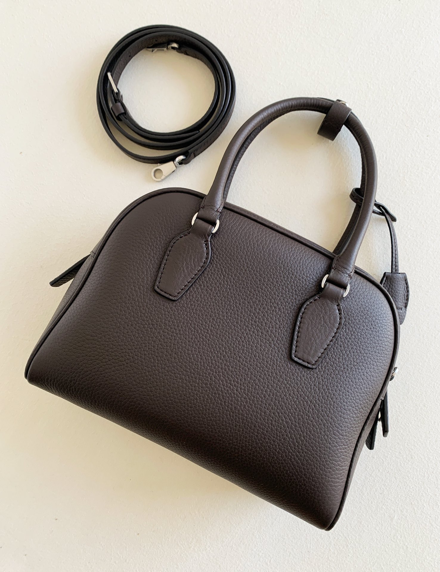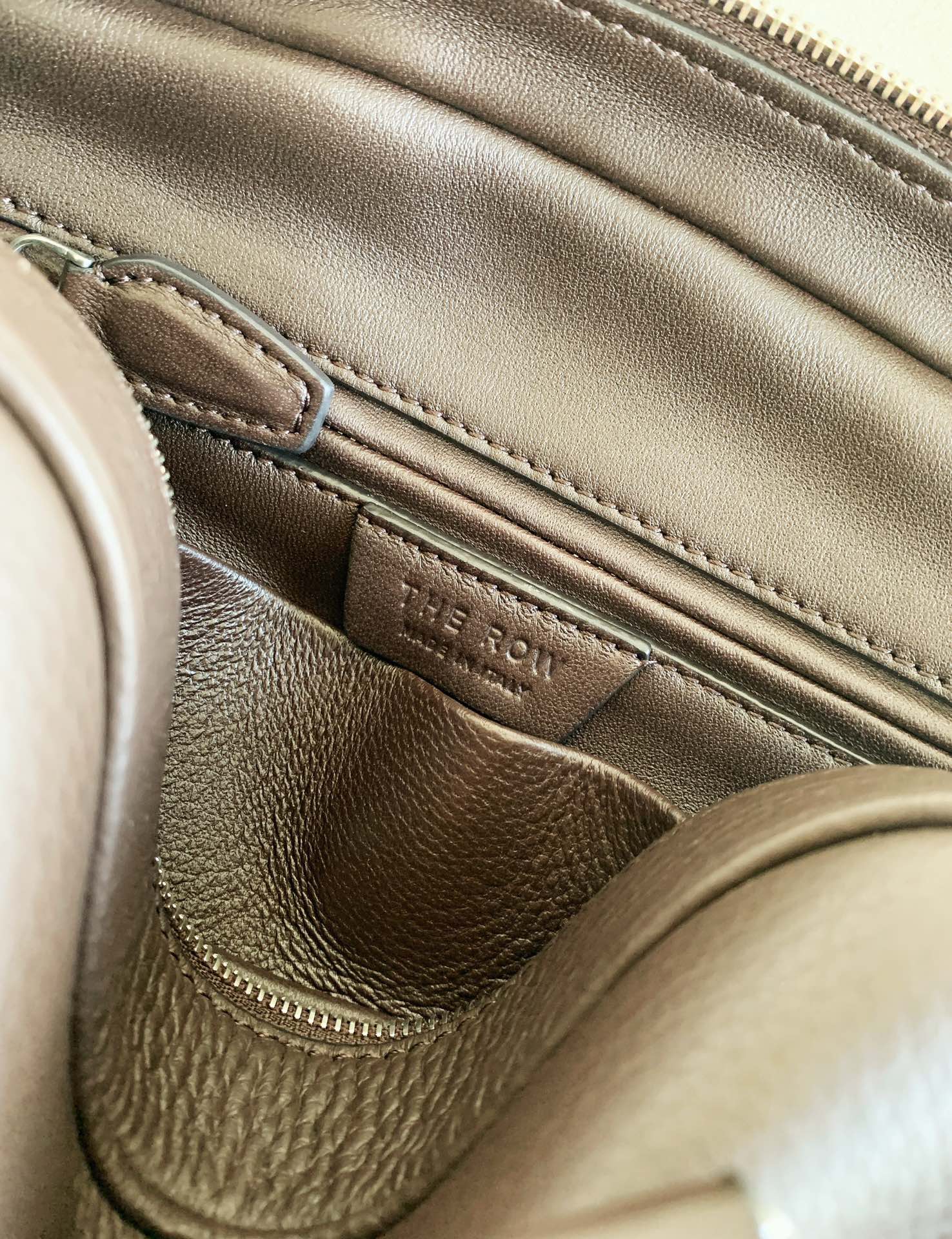 THE ROWの「India 10.0」トップハンドルバッグは、自然な風合いのカーフスキンレザーを使用したボウリングシルエットで、しなやかな手触りが特徴です。ブランドロゴ入りのメタルパドロックと鍵で、ジッパーをしっかりと閉じることができます。