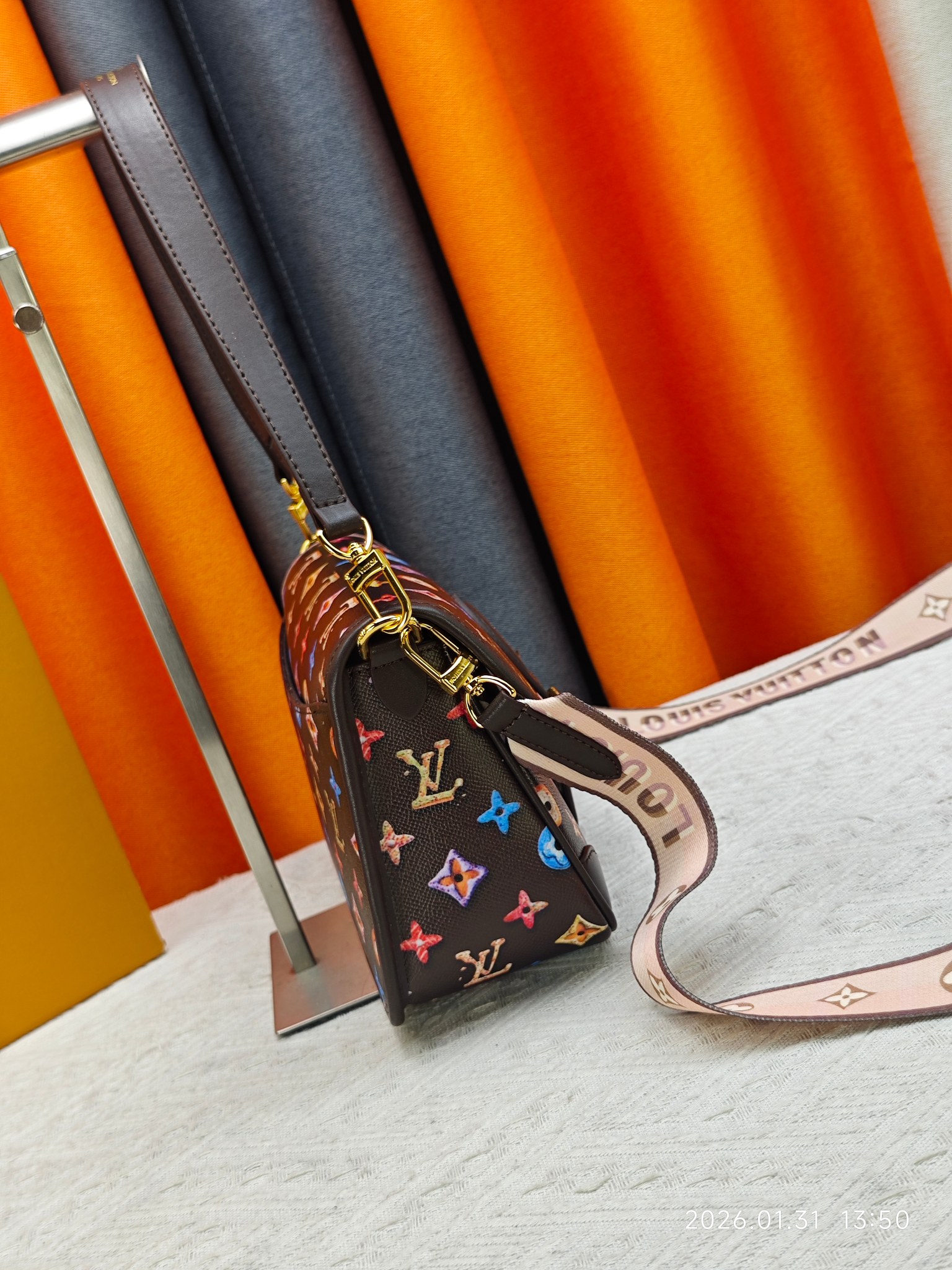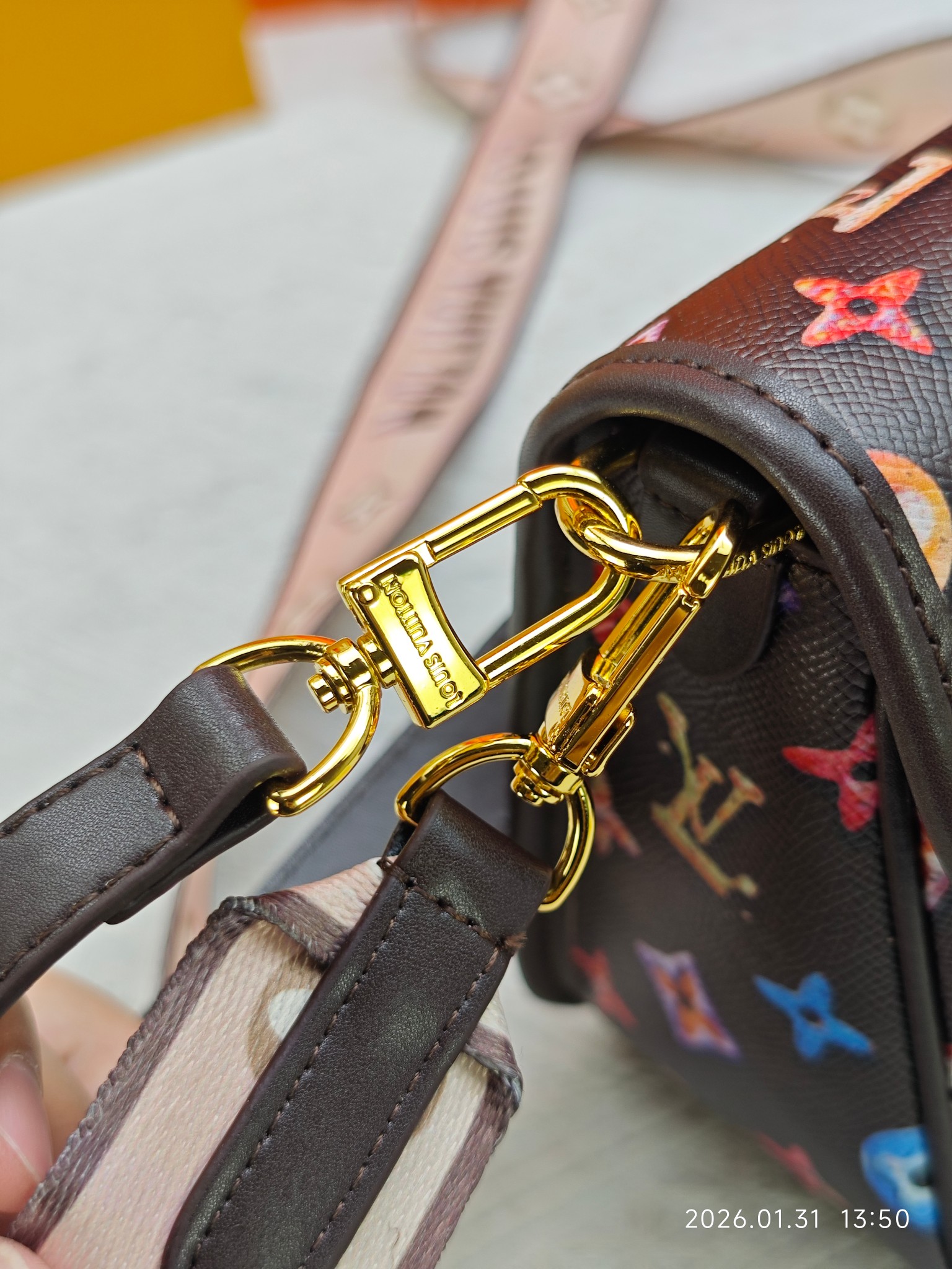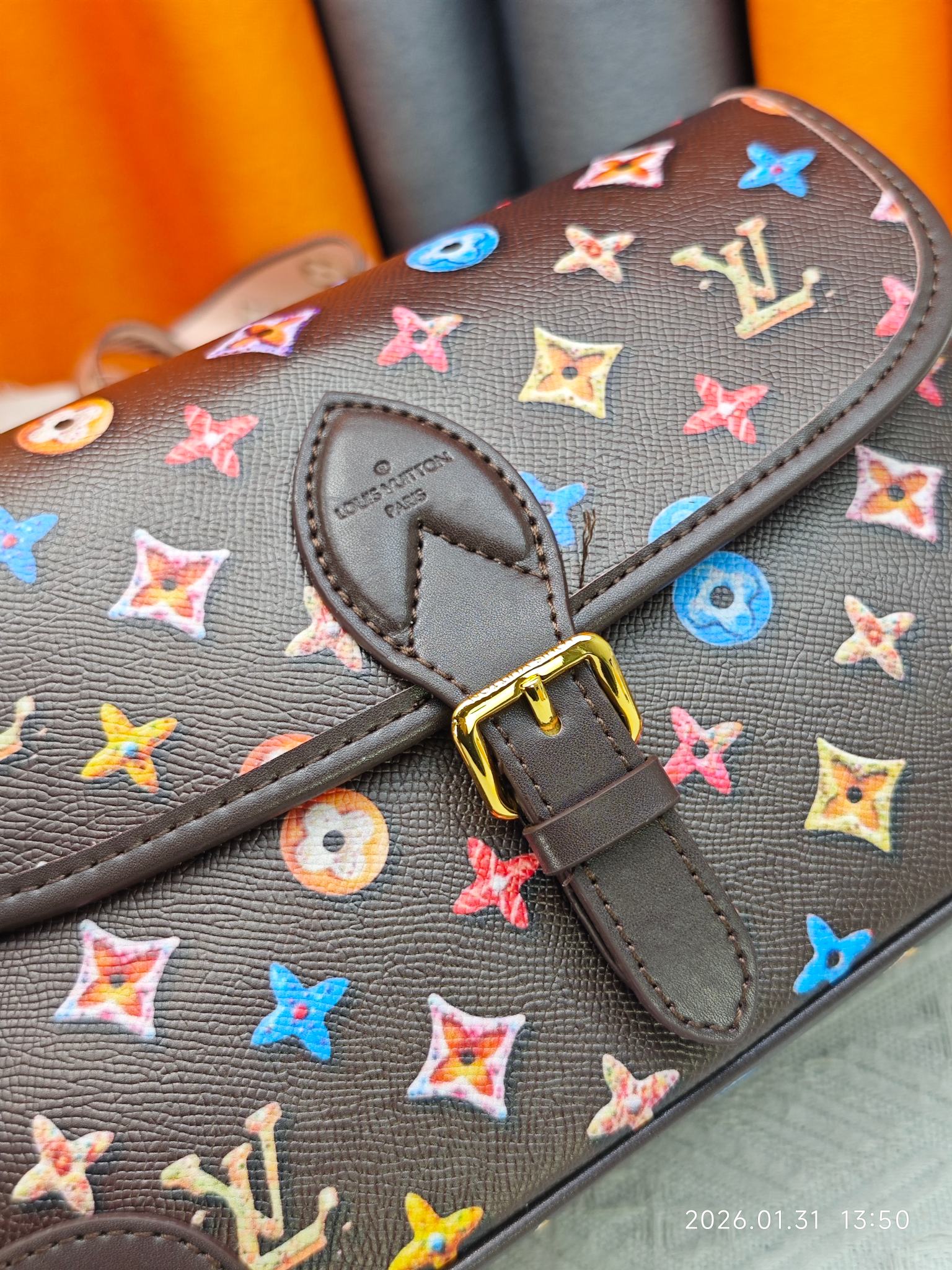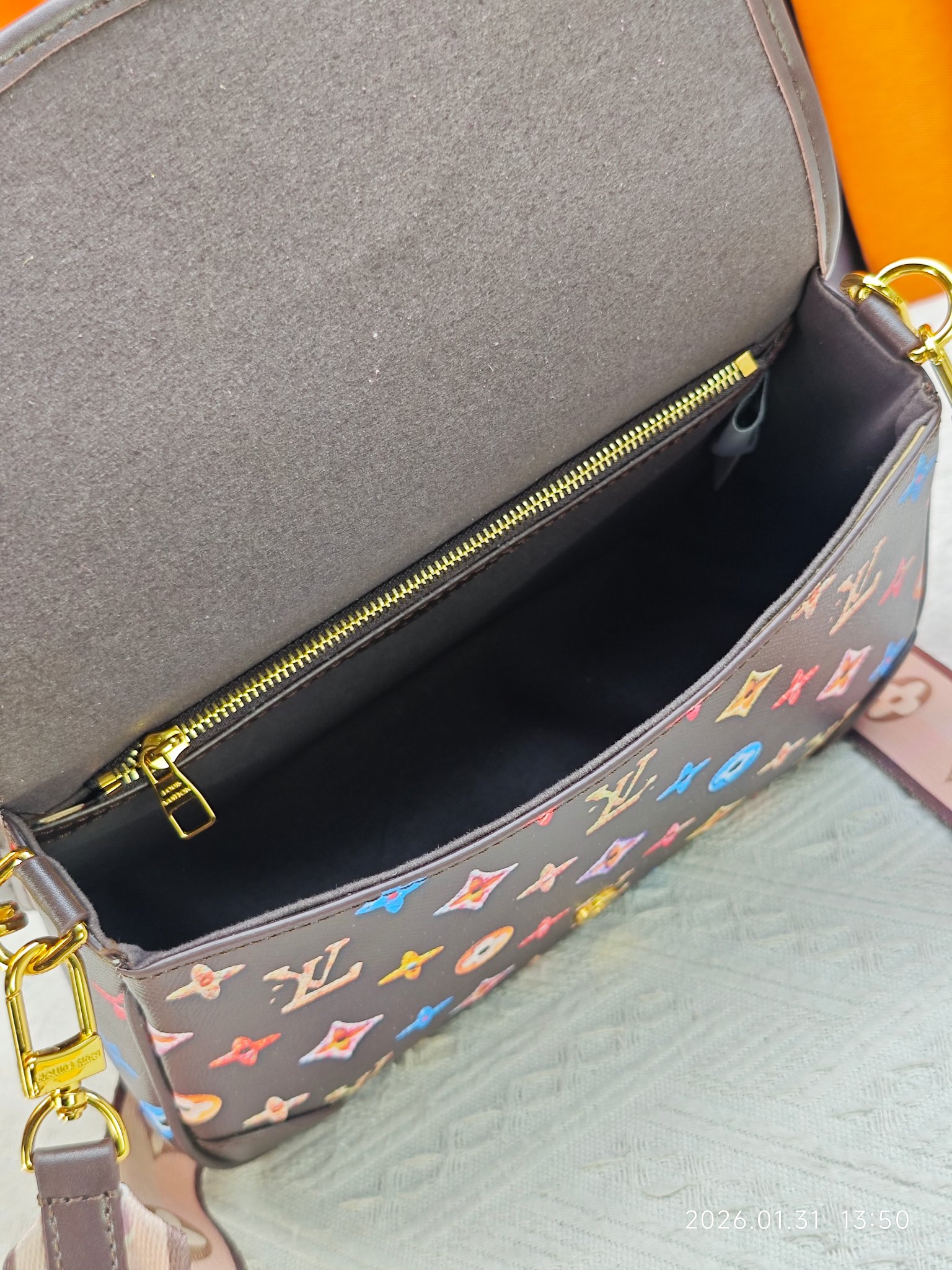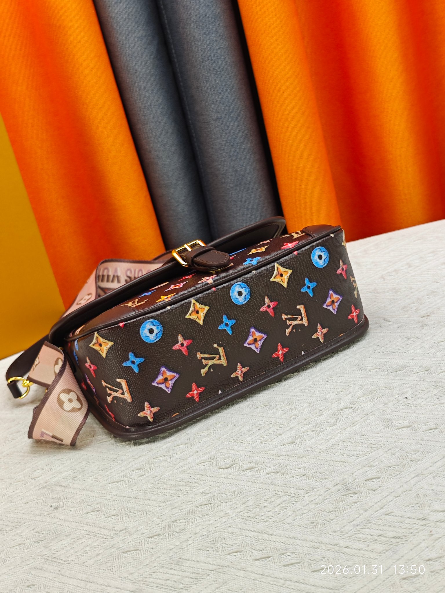 このカラフルなダイアンPMハンドバッグは、2026年に130周年を迎えるルイ・ヴィトンのモノグラムに敬意を表しています。象徴的なパターンをあしらったキャンバス地を使用し、滑らかな牛革でトリミングし、ゴールドトーンの金具と調和するスタッズの装飾が施されています。取り外し可能なストラップが付いており、内側には記念限定ラベルがあしらわれています。