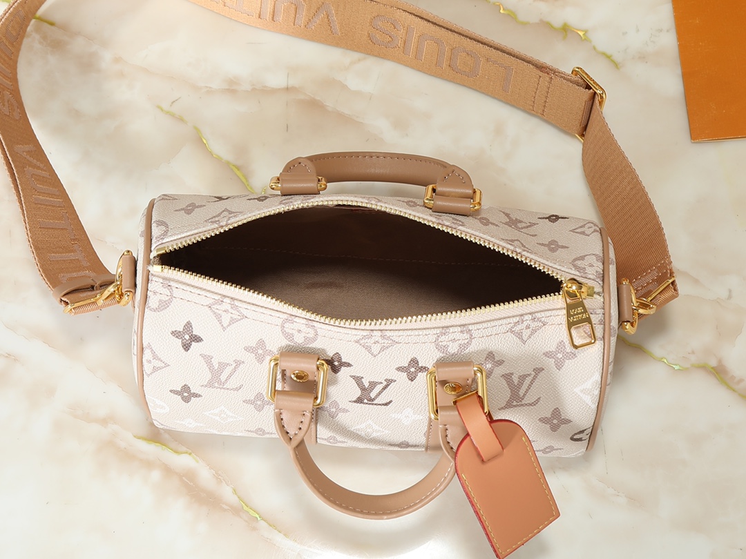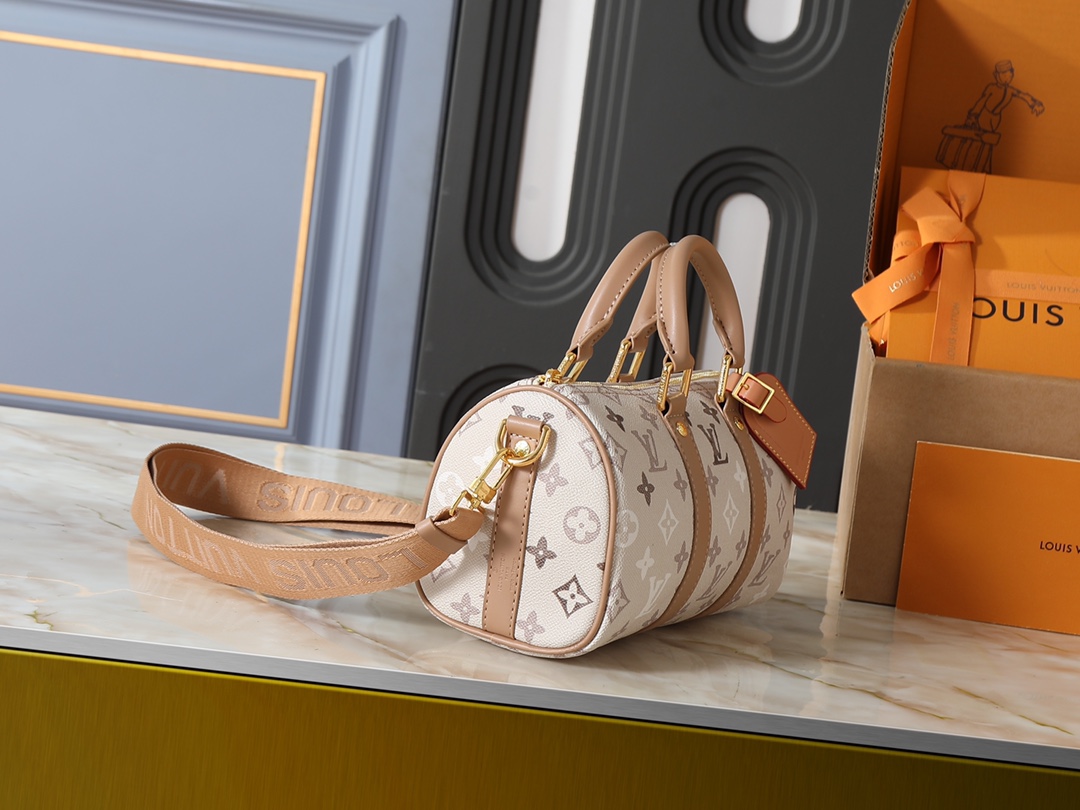 この Keepall Bandoulière 25 ボストンバッグは、モノグラム・エクリプス キャンバスのモダンな雰囲気を活かし、エイジドメタルの金具と、鮮やかなレザーを使用したサイドストラップ、ハンドル、ネームタグがアクセントを添えています。